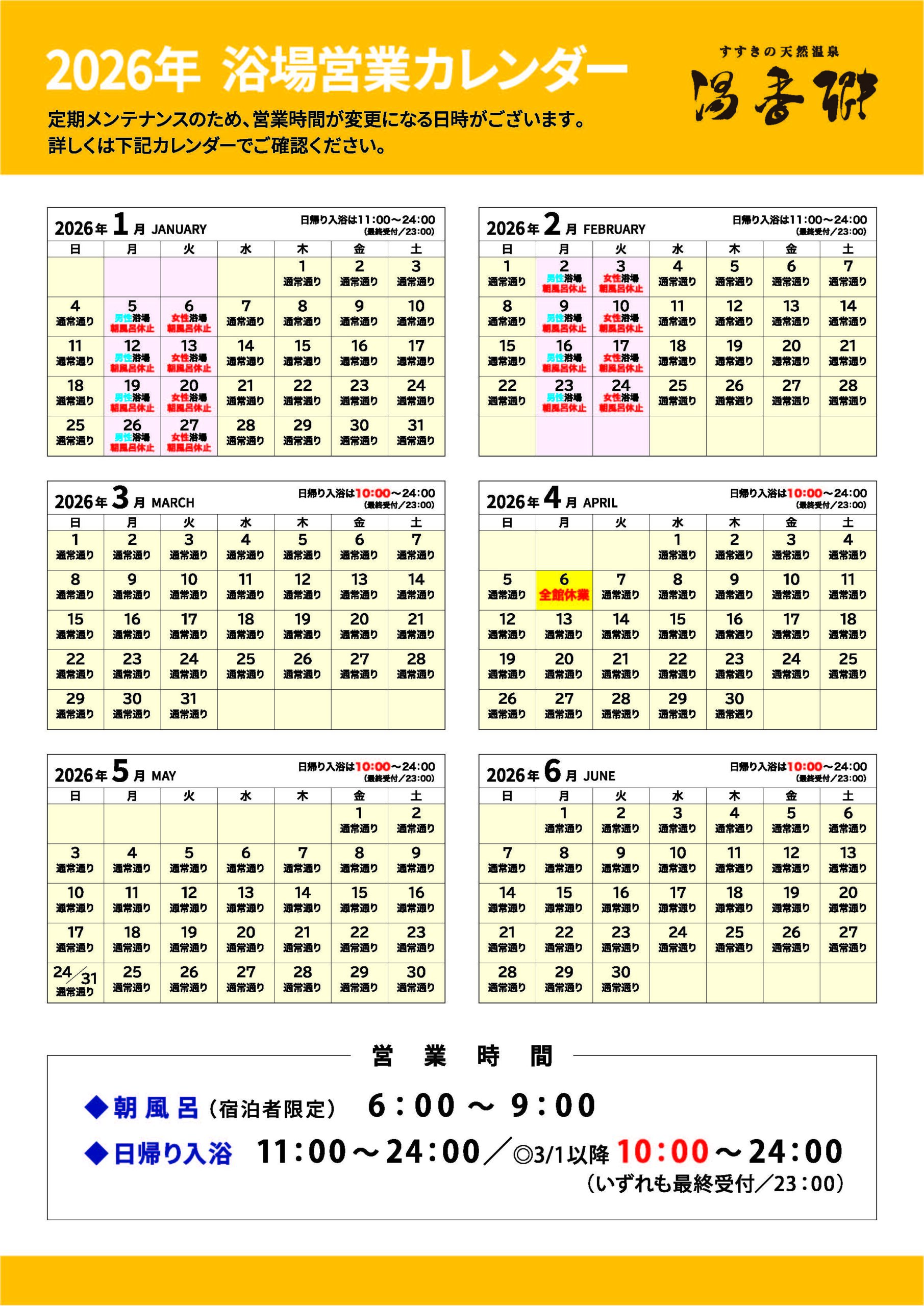 2026年3月1日(日)より、男女浴場ともに朝風呂の休止を終了いたします。
